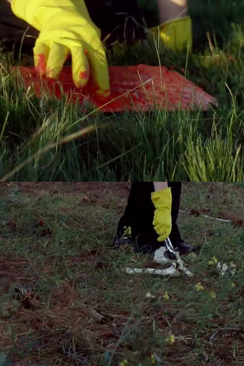 A nameless figure creates several artworks from a menagerie of glass, paint, and animal remains.