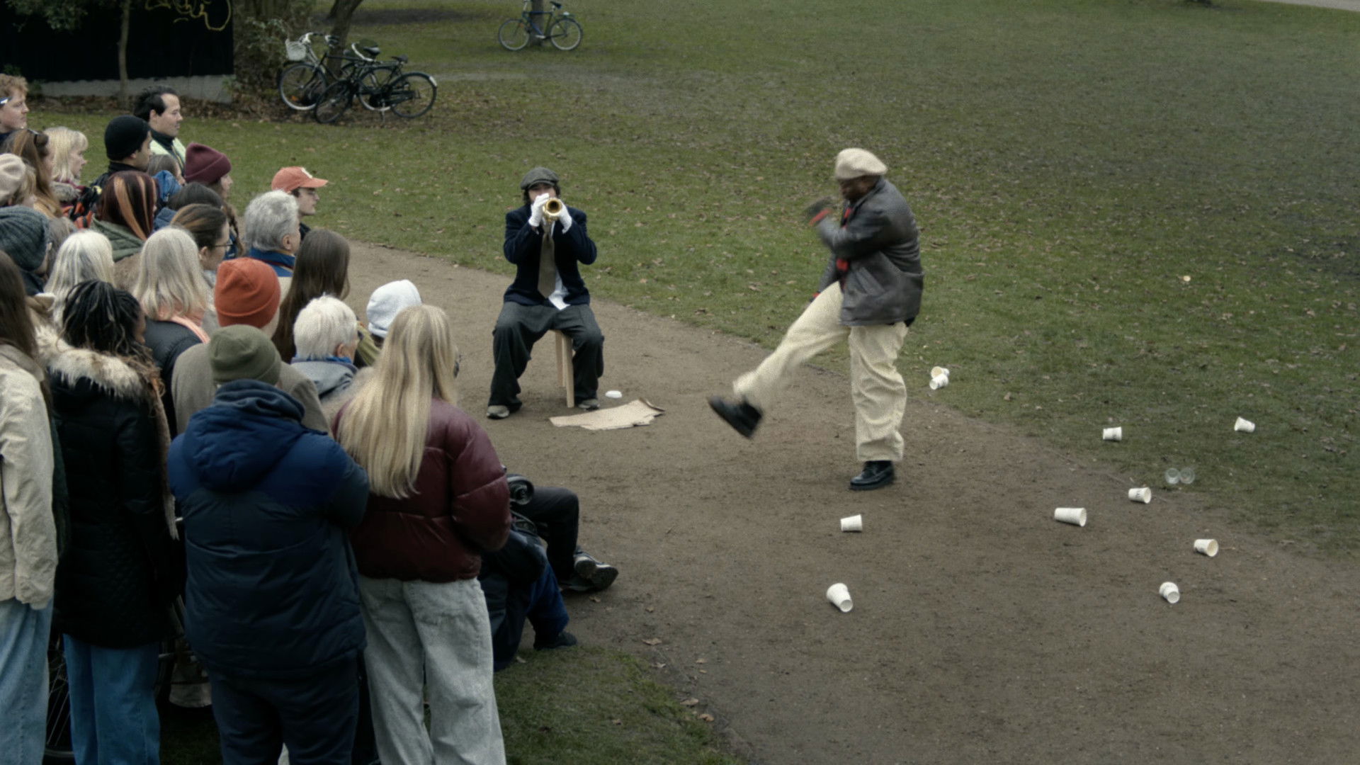 A crowd gathers in the park to determine whether or not a young man doing flips is AI-generated.