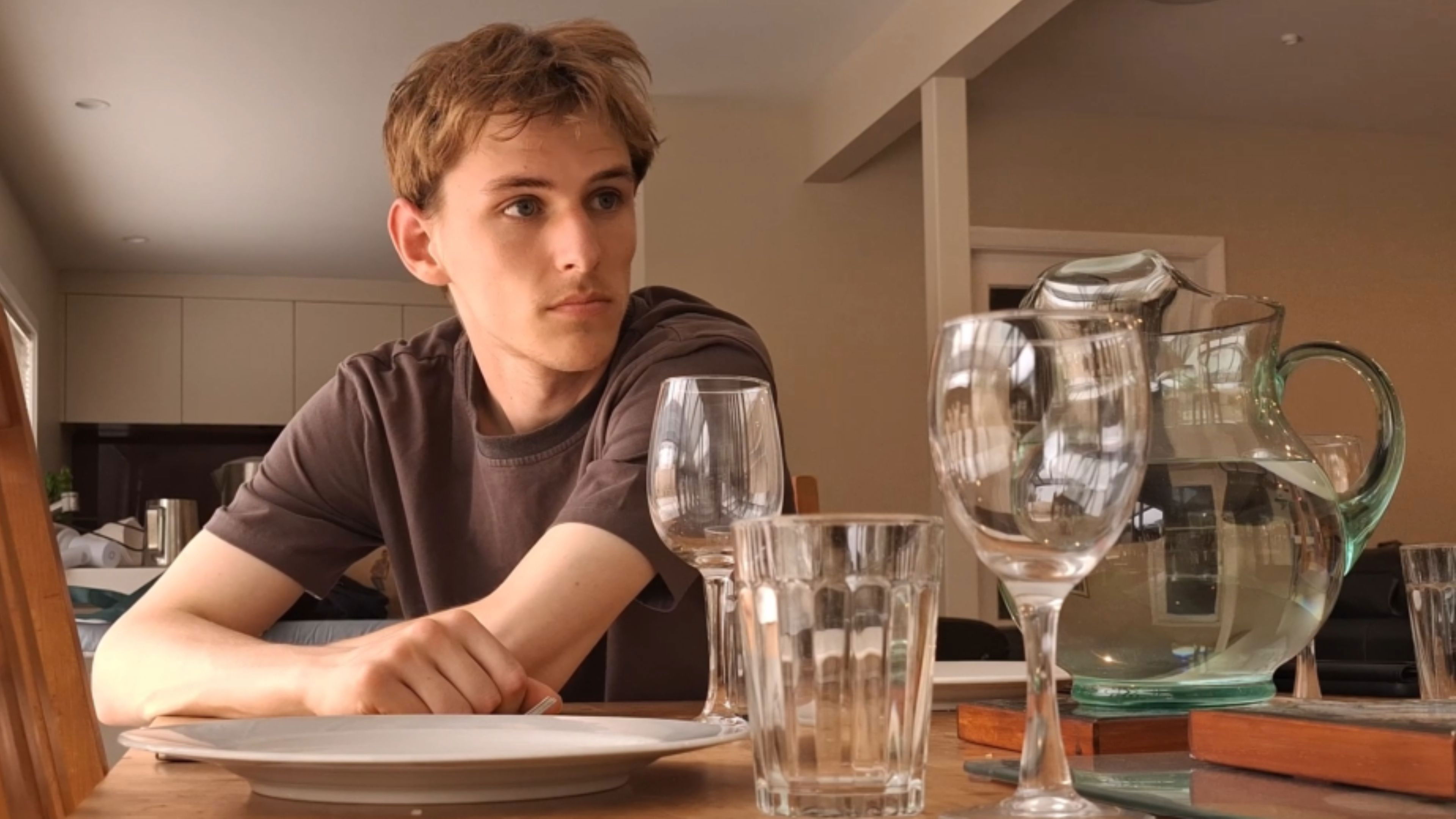 A man waits for guests who may arrive from another time.
