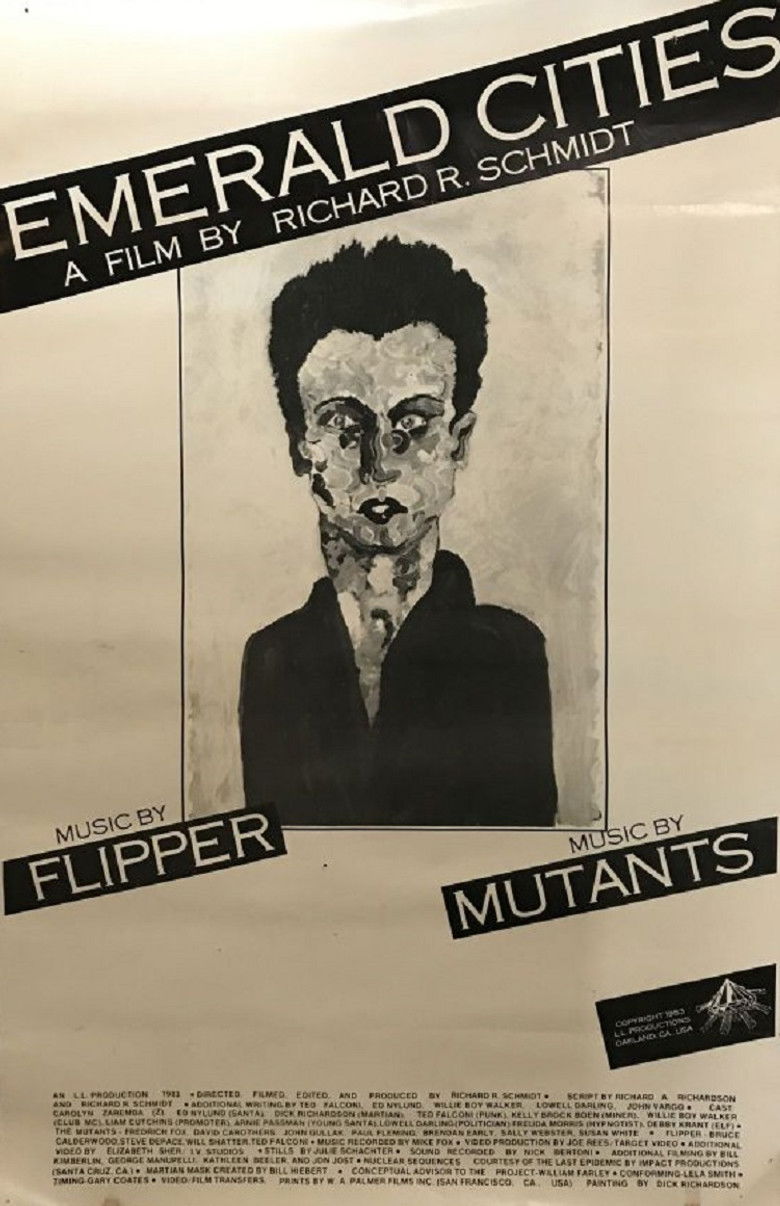 Emerald Cities, completing the trilogy, is a story about a young woman who runs off from her Death Valley home to seek her fortune. Her drunken dad still stuck in his Santa suit from the local Christmas pagent, follows and soon comes in contact with the "new dark ages" of 1984. Juxtapositions of "on-the street" interviews (by Willie Boy Walker), punk performances by bands Flipper and The Mutants, TV shows of past-life hypnotism and nuclear destruction, and a crazed ex-con all finally intermix with the characters' own sagas.