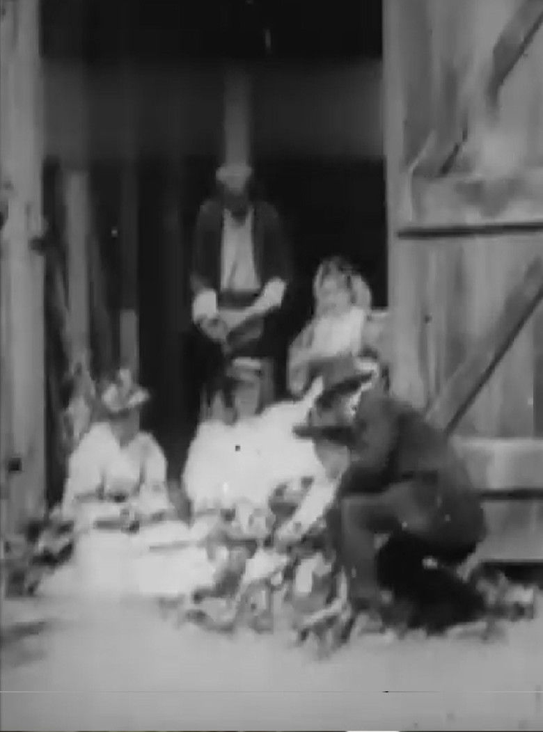 Shows a party of young people in front of a barn door, searching for the red ear, which is discovered, and the penalty exacted from one of the group who resists payment of the forfeit, thereby creating confusion and merriment. The group is animated, and is made up of real farmer boys and girls. During the progress of husking, the farmer arrives wheeling his little daughter to the sport on a barrow.